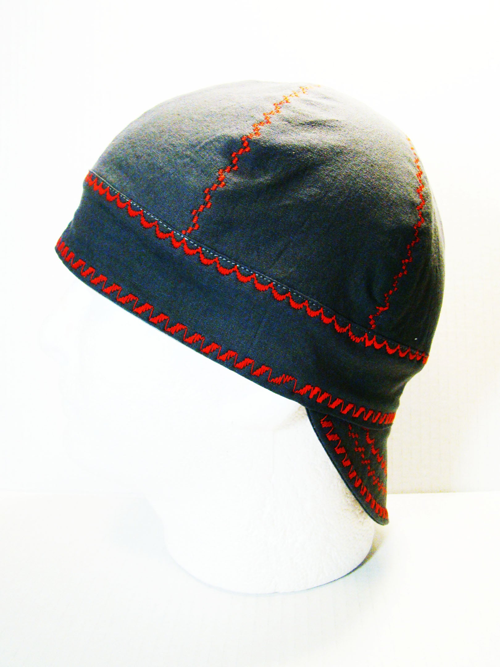 This reversible cap is made of 100% cotton of the best quality. Our linings, which change frequently, are also 100% cotton. Your beanie can have either a solid-colored or a printed lining. It is completely reversible and can be worn on either side. All fabric has been pre-shrunk before construction, so there will be minimal shrinkage. The brim is lined with 24oz cotton denim for a sturdy finish.