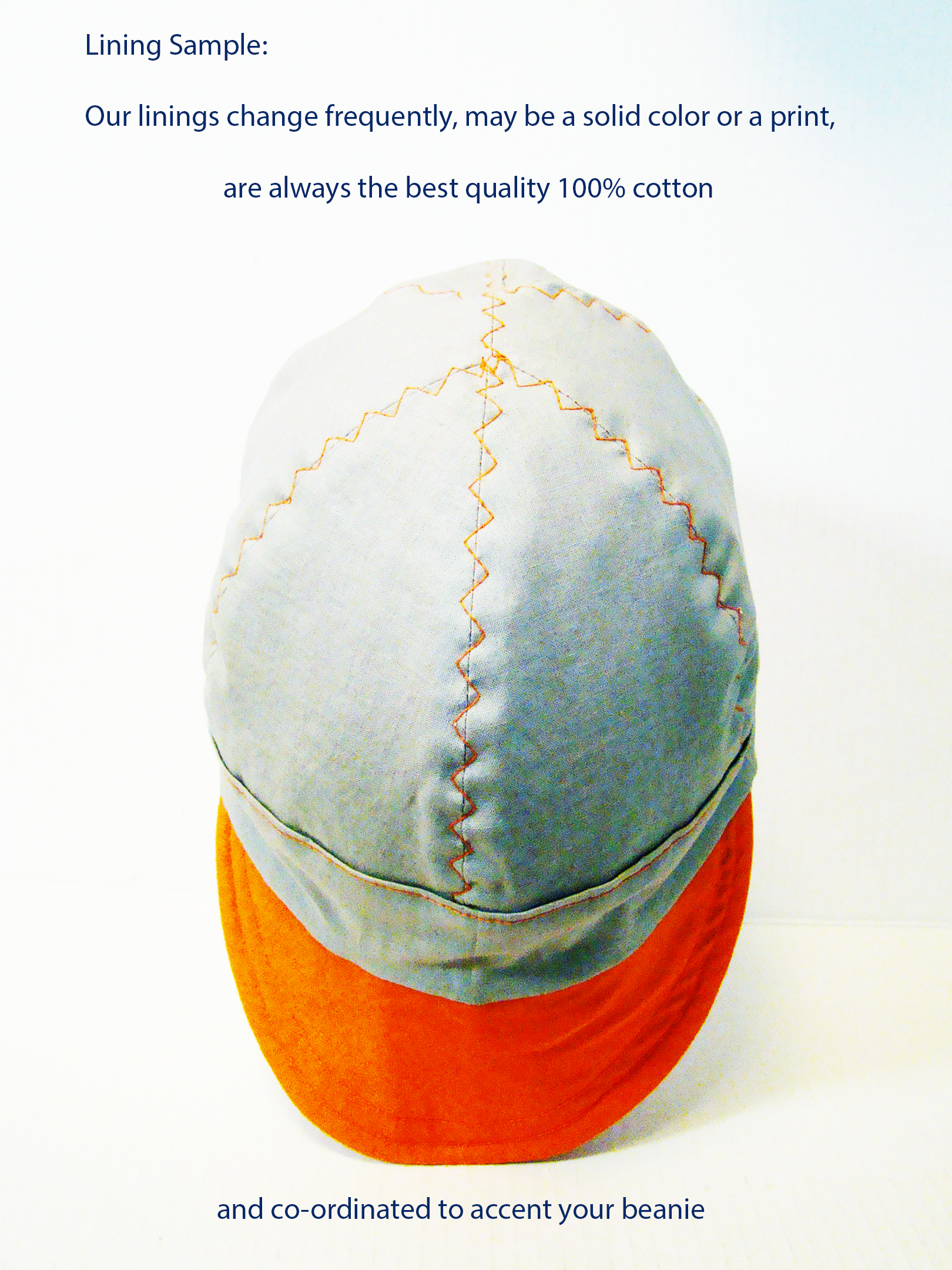 This reversible cap is made of 100% cotton of the best quality. Our linings, which change frequently, are also 100% cotton. Your beanie can have either a solid-colored or a printed lining. It is completely reversible and can be worn on either side. All fabric has been pre-shrunk before construction, so there will be minimal shrinkage. The brim is lined with 24oz cotton denim for a sturdy finish.