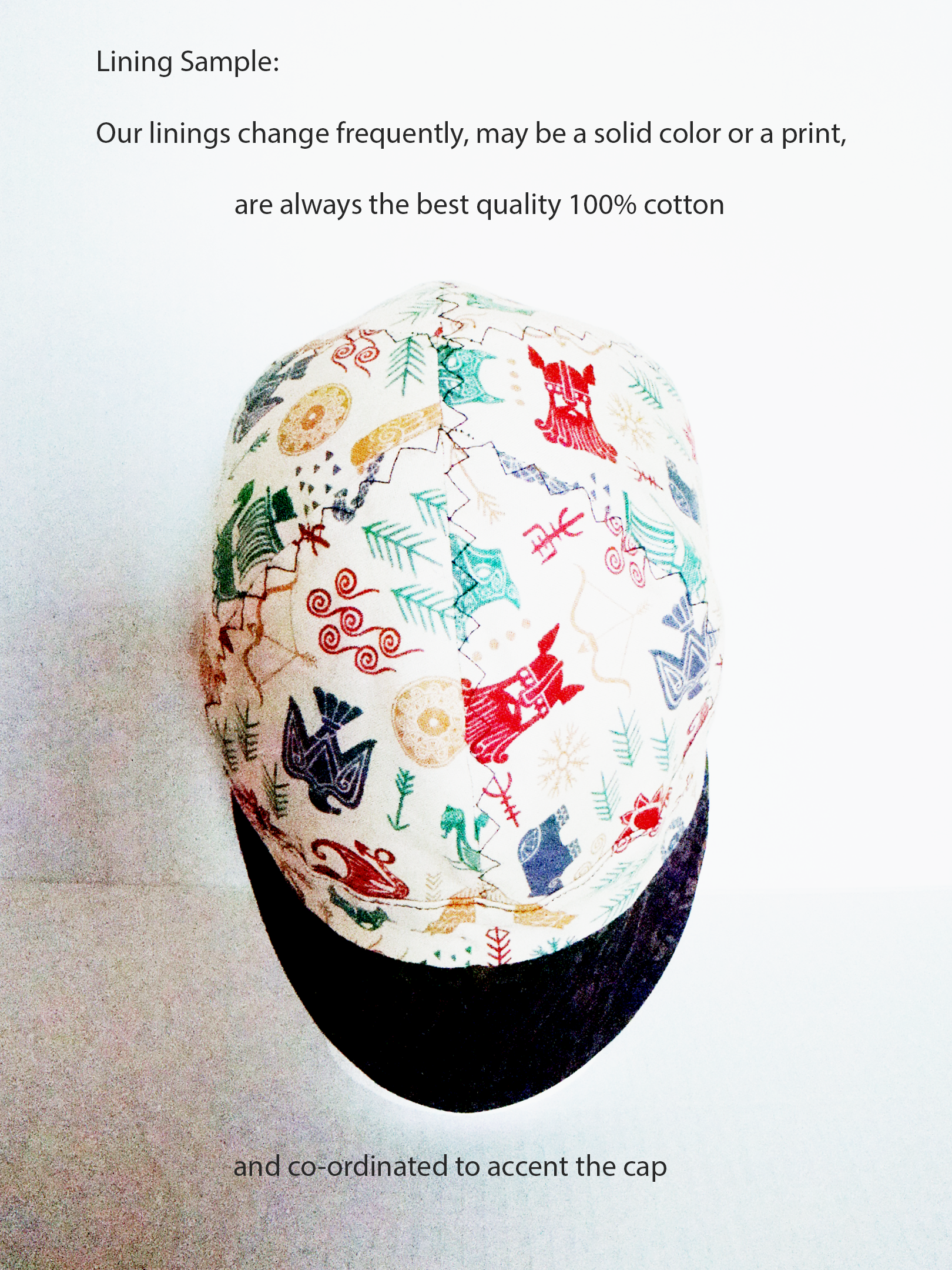 This reversible cap is made of 100% cotton of the best quality. Our linings, which change frequently, are also 100% cotton. Your beanie can have either a solid-colored or a printed lining. It is completely reversible and can be worn on either side. All fabric has been pre-shrunk before construction, so there will be minimal shrinkage. The brim is lined with 24oz cotton denim for a sturdy finish.